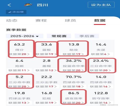 截止目前,四川队在新赛季5战皆墨。先后输给广州、青岛、山东、南京和北京。5场比赛输了136分,场均输27.2分。同时,球队多项技术统计,排名联盟倒数1-2名。